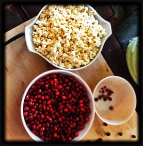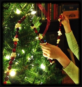 I’m pretty sure the kids ate more popcorn and cranberries than they strung. After three hours and a giant mess of popcorn crumbs and squashed cranberries, our tree is now adorned not only in pretty red and white strands, but also in memories of a cold afternoon spent with friends.